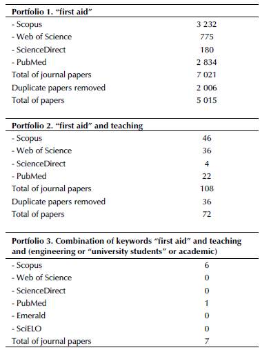 Portfolio 3 sought to explore, in the literature, the existence, formalization, and further approaches of first aid teaching in engineering degrees. This portfolio is directly aligned with a case report in this study, focusing on the teaching and knowledge transfer to a specific group of students. Unlike the other portfolios, the keywords were inserted in the papers' titles, abstracts, or keywords, and six databases were consulted (Scopus, Web of Science, ScienceDirect, PubMed, Emerald, and SciELO). The papers were exported to Mendeley, eliminating duplicates, and then read in full.