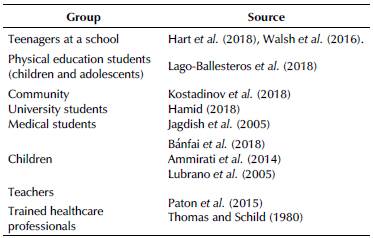 Some studies have focused on more specific approaches to first aid, highlighting mental health first aid (Hart et al., 2018), drug and alcohol first aid (Allan et al., 2016; Kostadinov et al., 2018), hypothermia and evaluation of clinical symptoms (Pysny et al., 2015), domestic accidents (Ergenekon, 2012), among others.
