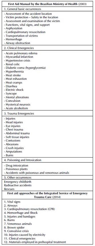 In addition to the first aid approaches presented in Table 4, the Brazilian Mobile Emergency Care Service (2002) provides detailed actions and instructions for first aid and prehospital treatment. Their material is in-depth and complete, especially concerning basic occurrences in first aid.