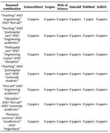 In order to determine whether undergraduate engineering students have knowledge about first aid, a new search was conducted, exploring six different databases. It sought to ascertain whether there were studies related to this matter, but it found that no papers focused on the permanent and continuous teaching of first aid; instead, there were only brief talks on the subject. Table 5 presents the total of papers found via each keyword combination.