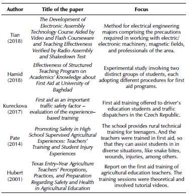 Studies on the teaching of first aid and prehospital care in engineering courses, or in higher education at large, are lacking except in fields related to human health, according to the paper analysis (Table 6).