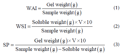 The procedure for determining WAI, WSI, and SP can be described as follows. 1,25 g of flour were taken, placed in a centrifuge tube with 30 mL of distilled water at 60 °C, and stirred. The mixture was placed in a thermostatic bath at 60 °C for 30 min, stirring after the first 10 min of heating. It was centrifuged at room temperature at 4 900 RPM for 30 min. The volume (V) was measured. 10 mL of the supernatant were taken and dried in an oven at 70 °C for 14 h. Centrifuge tubes weighed the sediment and dry residue (Anderson, 1982). The calculations were made by means of Equations (1), (2), and (3).