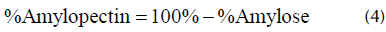 Amylose was quantified by spectrophotometry with a wavelength of 620 nm, using the calibration curve for the standard solution (Galicia et al., 2012). The amylopectin content was determined by difference using Equation (4).