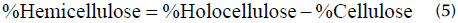 Cellulose was extracted from the pseudostem of the banana. To this effect, the fruit was cut into sections, washed with distilled water, separated by layers, and washed again. It was dried to constant weight and degreased using Soxhlet extraction. It was submitted to an acid treatment with a solution of CH3(COOH) at 80% (w/v) and HNO3 at 65% (w/v) with stirring. Then, it was shaken with a 10% (w/v) NaOH solution, washed, and dried at 55 °C. The obtained pulp was ground and sieved to reduce its size (Romero-Viloria et al., 2014). The cellulose content was determined with the Kurschner and Hoffer method, holocellulose by applying the TAPPI T-21 method, lignin with the Klason method, and hemicellulose through Equation (5) (Romero- Uscanga et al., 2014).