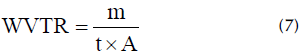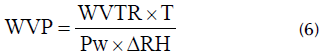 where WVP is the water vapor permeability (g/Pa.sm), and WVTR is the water vapor transmission rate (g/s.m2) calculated from the mass m (g), the time t (s) corresponding to the duration of the experiments (24 h), and the area A of the film exposed to the transfer of humidity (m2). T is the average thickness of the film (m), Pw is the partial pressure of pure water vapor (3 160 Pa at 25 °C), and ARH is the relative humidity gradient between the container (0%) and the medium (41%).