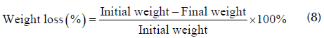 Biodegradability was measured through the weight loss of the thermoplastic material, based on a soil burial test (Saffian et al., 2016). The natural soil was collected free of composting material. The samples were weighed, placed with soil in polyethylene bags, and kept at room temperature with a relative humidity of approximately 43% for 40 days. Every ten days, the samples were removed, rinsed with water to remove soil residues, dried for one hour at room temperature to remove moisture, and finally weighed. The biodegradability percentage of the bioplastic for the evaluated environment was determined via weight difference with Equation (8).