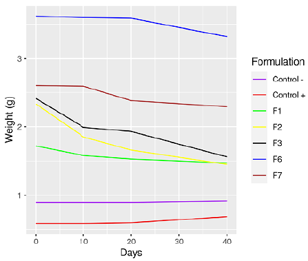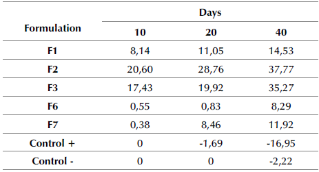 A decrease in the weight of the bioplastics was observed throughout testing, being more evident during the first ten days. The best result was for F2 with a weight loss of 37,77%, and the lowest value corresponded to F6 with 8,28%. The negative value in both the positive and negative controls implies a weight gain, probably due to the presence of moisture or traces of dirt. In a similar study, a weight loss of 64,21% was reported after 90 days in compost for a bioplastic made with potato starch (Meza et al., 2016). On the other hand, in the evaluation of a bioplastic based on a banana peel for agricultural purposes, 65,10% of the initial weight was lost in a period of eight weeks; its degradation process is much faster compared to other commercial plastics intended for sowing (Huzaisham and Marsi, 2020).
