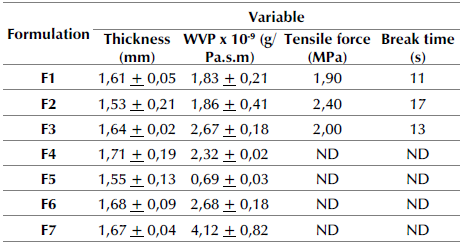 The results of the thickness, WVP, tensile strength and, break time tests for each formulation are shown in Table 4.