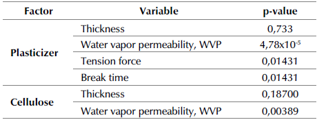 The above-mentioned procedure was repeated to determine the influence exerted by cellulose on the characteristics of the material obtained. Fisher's test was used for the thickness and WVP variables. The corresponding results for both factors (plasticizer used and addition of cellulose) are shown in Table 5.