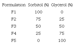 Before defining the experimental design, a preliminary test of 16 formulations was carried out with different compositions of banana peel flour, cellulose, water, glycerin, sorbitol, and 5 and 15% NaOH solutions (w/v) in order to identify the mixtures that form the film. In each plastic mixture, the pH was measured with a potentiometer. Based on the results, a mixture design was elaborated, with fixed amounts of banana peel flour (5 g), 15% NaOH (5 mL), and water (4 mL), varying the concentrations of the plasticizers used, which were glycerol and sorbitol (0 to 2 g) (Table 1).