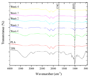 Additionally, the spectra of TPS were compared because, when it blends with PLA, the mechanical, thermal, and other properties related to these mixtures (PILATPS) are modified. Therefore, the peaks to be analyzed were established between 750 and 1 250 cm-1 in order to understand the behavior of the TPS structure regarding its amylose/ amylopectin composition before blending, as it is important to understand the crystalline and amorphous behavior of these molecules in the mixture. The stretching attributed to bands 1 040 cm-1 (C-O), 1 024 cm-1 (C-C), and 680 cm-1 (C-O-C) indicates a sensitivity to crystalline change. In other words, decreasing the crystallinity increases the 1 024 cm-1 band, whereas the intensity of the peak at 1 040 cm-1 increases with crystallinity, considering the crystalline structures of starch in this area (Cao et al., 2020). The intensity ratio between these two bands (1 046/1 024 cm-1) is 1,72, thus indicating an increase in crystallinity in starch, which has a high degree of organization and is composed mainly of amylopectin (Özeren et al., 2020; Mierzwa-Hersztek et al., 2019; Homez et al., 2018; Nevoralová et al., 2019). The PILATPS film spectra show a stretch in the OH group in the region from 3 260 to 3 350 cm-1. Likewise, the characteristic -CH peak of starch shows stretching in the 2 914 cm-1 band. The 1 024 cm-1 peak exhibited a shrinkage that could be due to starch retrogradation. When exposing the film to the biodegradation process, structural changes were evidenced; the TPS present in the film degraded from W0 to W4. These changes could be observed in the spectra and are attributed to changes in the crystallinity of starch, which is reflected by the glycosidic bonds of the TPS Neat and could be due to the fact that starch degradation occurs first in the amorphous region (amylose) as well as in the PLA, where the hydrogen bonds are very weak and more accessible to microorganisms, which degrades substantially faster compared to the crystalline part (Sedničková et al., 2018). The bands located at 1 040 cm-1 indicate a C-O functional group. The band located at 1 024 cm-1 indicates the amorphous region of starch given the presence of the C-C group. Similar observations were reported by Palai et al. (2019) and Wang et al. (2020), as well as at 680 cm-1 with vibrations for the C-O-C group (Gopi et al., 2019). The decrease in peak intensity at 1 178 cm-1 for PLA/TPS may be due to the weak chemical interaction between PLA and TPS (Muller et al., 2017).