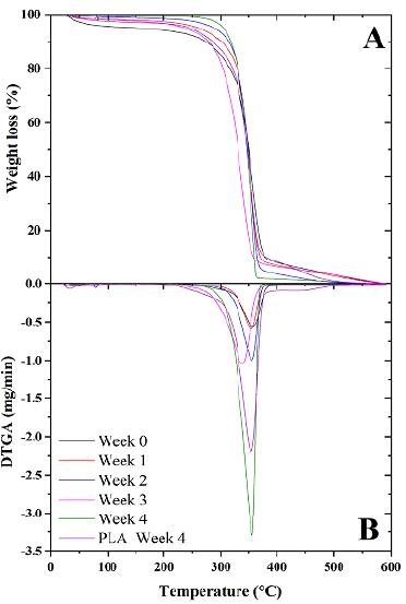 A loss of mass could be observed which reflected the condensation of hydroxyl groups (300-400 °C) (Figures 2a and b). The magnitude and location of this mass loss changed according to the degradation time (W0 to W4). In W1 and W2, the film showed a significant mass loss in the temperature range of 350-365 °C, which indicates the condensation of the hydroxyl groups of cassava starch. In W3 and W4, there was a mass loss in the range of 340-350 °C, which corresponds to the degradation of the PLA present in the blend. Similar results were reported by Nasseri et al. (2020) for mixtures of acetylated rice starch and PLA. The degradation temperatures decreased due to the consumption of the starch content by the microorganisms (de Oliveira, Barbosa, et al., 2019; de Oliveira, de Oliveira Mota et al., 2019; Gralde, et al., 2019).