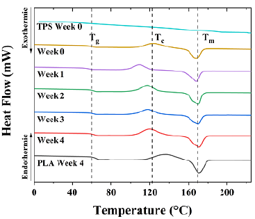 The DSC curves show the glass transition (Tg), crystallization (Tc), and melting I (Tm) temperatures (Figure 3). The Tg is around 60 °C in the analyzed samples. It increases in W3 and W4 and has a lower value in W1 and W2, which could be due to the difference in the nature of the incidence of starch. The addition of TPS within the PLA matrix resulted in a decrease in the Tg of the PLA/TPS blends. A decrease in Tg increased the starch concentration (Li et al., 2020). This decrease in the Tg of the films can be attributed to the plastification of starch with glycerol, given the mobility of the chains caused by the migration of glycerol in the dispersed phase of TPS (Özeren et al., 2020). This effect is also attributed to the nucleation of the dispersed phase of TPS (Cai et al., 2014). The Tc of the samples (Table 2) shows a temperature decrease from 135 to 100 °C in W1, which was reflected on the weeks of biodegradation. This temperature, in comparison with that of PLA, is correlated with the TGA and FTIR results, where structural changes in the film were observed during the biodegradation process. A single endothermic peak for melting at 170 °C was observed in all weeks. Additionally, all PLA/TPS blends showed an increase in the intensity of the endothermal peak attributed to the laminar arrangement and polymorphism of the PLA's crystalline structure (Anakabe et al., 2017).