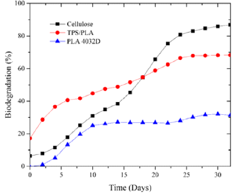 The addition of PLA and TPS is synergistic and significantly contributes to preservation and biodegradation processes by means of increasing or decreasing the crystallinity due to the number of amorphous phases present in the polymer. The biodegradability of the blends was confirmed by weight loss measurements with exposure time in the soil process. TPS accelerates the biodegradability of the blends in this medium due to its accessibility to microorganisms, its hydrophilic properties, and its amylose composition, which can be degraded more rapidly. The materials obtained from mixtures of TPS and PLA provide an additional advantage derived from the use of renewable sources for their manufacturing, as they provide the mixture with hydrophilic and biodegradable properties. This is an advantage over conventional plastics that must be exploited in order to obtain resistant materials which can be used in a similar way to conventional polymers.