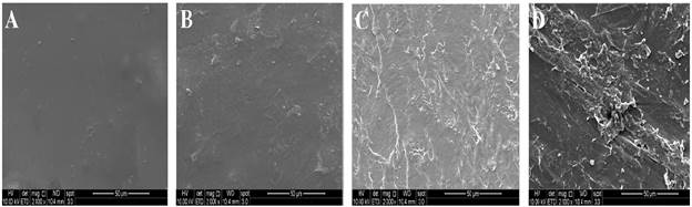 The surface changes of the TPS/PLA blends during soil degradation (Figure 5) show that the film surfaces were smooth before degradation, and, after degrading under soil conditions during the evaluation time, they became rough; depressions and scratches appeared on the surface of these blends, similar to that reported by Lv et al. (2018) and Lv, Gu et al. (2017) for samples of 306D PLA and corn starch. After 30 days, there were fractures on the surface of each sample, cracks that would lead to the loss of mechanical strength. There were morphological changes regarding the color and shape of the film surface, which resulted from the attack of microorganisms to the PLA/TPS films (60:40) (Phetwarotai et al., 2013).