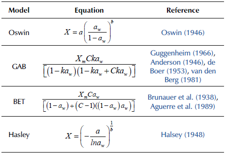 The sorption isotherms were determined at 10, 25, and 35 °C using a vapor sorption analyzer (Aqua Lab VSA, USA) with an aw range of 0,5-0,95. The equilibrium moisture content on a dry basis was plotted against the aw in order to obtain the equilibrium moisture curves (Dutcher et al., 2011). The performance of the models (Table 1) was evaluated via the adjusted coefficient of determination (R2adj) and mean square error (MSE). The models were selected on the basis of a high R2adj- and a low MSE (Andrade et al., 2011; Arslan-Tontul, 2020; Homez et al., 2018; Iglesias and Chirife, 1995; Torres et al., 2012).