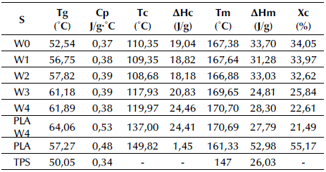 The diffusion coefficient of water in an amorphous or semi-crystalline polymer is related to the molecular dynamics of its amorphous regions (Shogren et al., 2003). If the temperature of an amorphous system (polymer-water) is above the glass transition temperature, the movement will be rapid, the free volume will increase, and the water vapor permeability will be high. Moisture penetration through the film may be due to cavities within the film that produce increased water vapor permeability, which has been linked to the two-phase morphology of PLA/TPS blends.