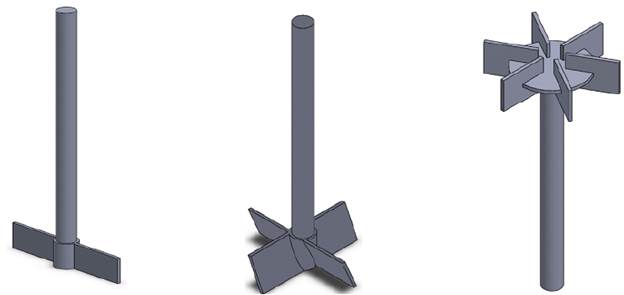 In this work, three different impellers were used to generate diverse flow patterns inside the system and observe the effect of different geometries on the dissolution process. The types of conventional agitators used were: