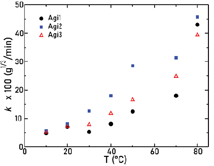 The activation energy was approximately the same for the three types of agitators used, regardless of their geometry. For the pre-exponential factors, a remarkable difference appeared among the agitators, which leads us to conclude that the geometry of the agitator can affect the kinetic constant specifically in the pre-exponential factor.