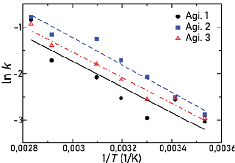 Figure 11 shows the natural logarithm of the solid dissolution constant as a function of the inverse of the temperature for the three types of agitators used in this work. In this Figure, it is possible to observe how every straight line has approximately the same slope (Table 2). Differences between them are about 6% at most. Therefore, it is possible to conclude that the activation energy is approximately the same for all cases and is independent of the agitator geometry. This activation energy is similar to the 23 kJ/ mol value reported by (Beauchamp, 2001). However, in Table 3, which summarizes the pre-exponential factors (A), some remarkable variations appear, since line intercepts in Figure 11 are different in each situation.