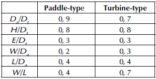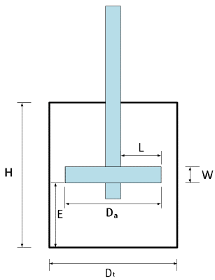 Empirical geometric proportions of the tank and agitator, which are illustrated in Figure 2, were taken into account for the paddle-type and turbine-type agitators shown in Table 1, where Da is the propeller diameter, Dt is the water tank diameter, W is the width of the propeller blade, H is the water tank height, and E is the height of the propeller with respect to the water tank bottom. Dimensions were measured using a caliper with an error of ±.