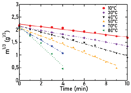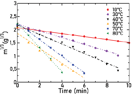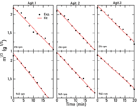 Figure 5 represents the cube root of mass as a function of time and at room temperature. Dots correspond to experimental points and lines to a linear fit. Although several angular frequencies were considered, for this Figure only, the lowest and the highest angular frequencies are shown for every agitator.
