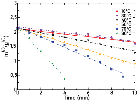 Figures 7, 8, and 9 show the cube root of mass as a function of time for agitators 1, 2, and 3, respectively, for different temperatures as indicated in each Figure. Lines correspond to the fit to the experimental points. In all cases, the angular frequency was held at 632 rpm.