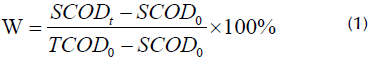 where SCODt is the supernatant COD value after pretreatment, SCOD0 is the original supernatant COD value, and TCOD0 is the original TCOD value.