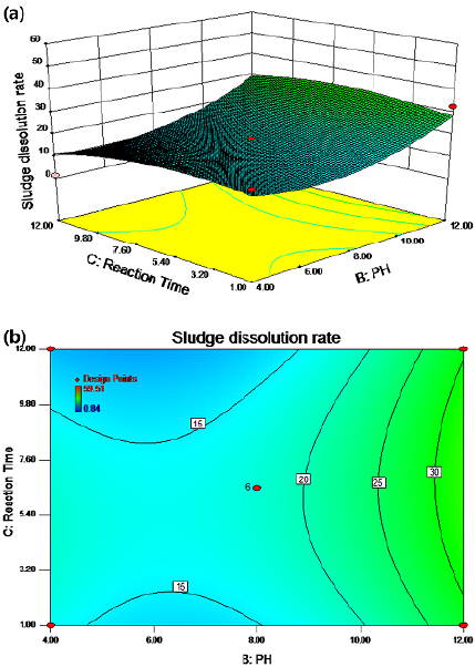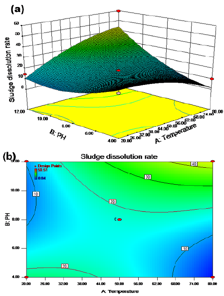 The interaction effect of the temperature and pH values on the residual sludge cell dissolution rate is shown in Figures 1a and 1b. The results in Figures 4a and 5a show that the effect of the pH value on the residual sludge dissolution rate was significant. A positive linear relationship was observed, where an increased pH value caused an increase in the cell dissolution rate. Like the pH, increasing the temperature improved the dissolution rate.
