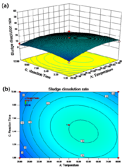 As shown in Figures 1-6, two factors had a synergistic effect and could achieve the optimal treatment conditions, albeit within a specific range. There was an interaction between pH and temperature, and an optimal region of cell dissolution rate was observed in the 3D diagram. On the lower left corner of Figure 1b, the cell dissolution rate was relatively high (more than 20%). The correlation of SCOD with the low alkaline condition was relatively small, but there was a quite high correlation under high alkaline conditions. A possible explanation could be that only the flocculation structure of the sludge could be destroyed when the amount of alkaline was low, unlike the cellular structure of the microorganisms. However, both structures could be destroyed simultaneously under high alkalinity to produce organic materials such as hydrolyzed proteins and carbohydrates. Originally insoluble organic matter in the sludge were also released from microbial cells and became soluble substances, so the SCOD concentration of the sludge increased (Wilson and Novak, 2009).