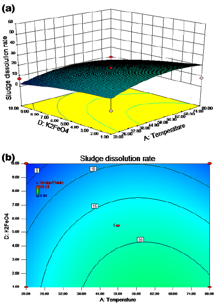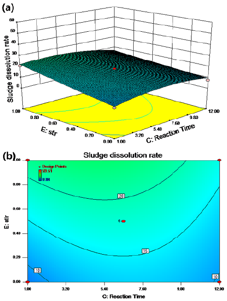 Changes in the residual sludge cell dissolution rate could be clearly observed, which are represented by color changes in Figures 1-6 (Capela et al., 2017). The strength of the interaction between two factors is represented by the change in the contour line. An ellipse indicates that two factors interacted significantly, whereas a circle means the opposite. All seven diagrams in this study had ellipse shapes, thus indicating significant interaction effects between factors.