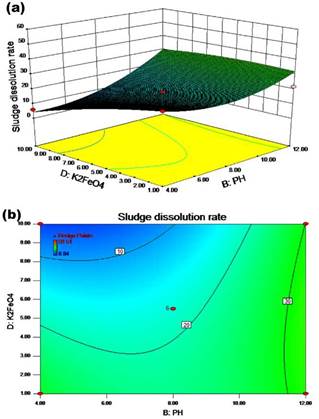 The effect of the interaction between the reaction time and the pH value on residual sludge cell dissolution rate is shown in Figure 2b. The results showed that the cell dissolution rate of the residual sludge increased with an increased pH value. The cell dissolution rate was above 20%, as shown in Figure 5a, when the pH value was relatively low and the amount of potassium ferrate additive was lower than 4,5 mg/g SS. The cell dissolution rate was not affected by the amount of potassium ferrate and the reaction time when the pH value was over 10. The rate was more than 30% according to Figures 2b and 5a. The influence of the reaction time on the excess sludge cell dissolution rate was not significant, which was similar to the results shown in Figures 1b and 6a. From the contour map and 3D diagram, the effect of the interaction between pH and reaction time was not significant -based on the numbers and color change. Therefore, the pH value played a vital role in this reaction process.