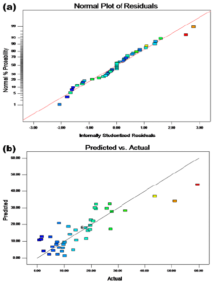 Experimental data points were randomly scattered on both sides of the predicted straight line (Figure 7a), thus indicating an acceptable fit. The following quadratic multinomial regression equation for the sludge cell dissolution rate was obtained via Design-Expert for experimental design and multivariate analysis: