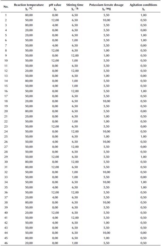 The experiment was conducted in a common laboratory. Samples from the pharmaceutical wastewater treatment plant were stored in plastic bottles and used for experiments either right away or after 5 h of being kept in a refrigerator at 4 °C. The wastewater sample was first evenly shaken, and about 300 mL of wastewater were poured into a 500 ml beaker. The pH value was adjusted using the 1:9 ratio of hydrochloric acid or 4 M of sodium hydroxide solution, and its value was obtained with a pH meter. Next, potassium ferrate was added into the wastewater sample, which was put in a blender for full mixing. The heating mode of the blender was also switched on in order to achieve the designated temperatures and start reactions. The 46 detailed test parameters are listed in Table 2. After the pretreatment, three wastewater samples of equal volume were put in a centrifuge for 30 min with a rotation rate of 1 500 rpm.