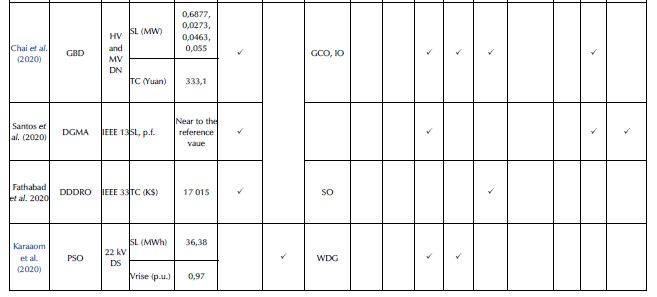 The PSO method was studied in a 22 kV distribution system (DS) in Thailand to reduce the system energy losses caused by the inappropriate allocation of DG. Additionally, the concept of load transfer was used, and, to this effect, the tie-switch location was identified through this nature-inspired optimization algorithm. A comparison of results demonstrated reduced energy losses and a voltage profile increase of 40,38 and 6,59%, respectively, which took 3,13 h (Karaaom et al., 2020).