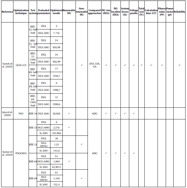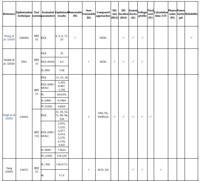 An comparative assessment of renewable DG optimization is given in Table 1. The analysis was carried out in terms of the DG optimization technique, the test system, the parameters evaluated, and the optimized outcomes. The Table provides an insight into the literature on DG allocation in distribution networks.