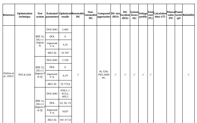 RESUMEN: Los recursos energéticos distribuidos, o generación distribuida (GD), son el pilar de los sistemas energéticos modernos, que tienen como objetivo generar energía verde a través de la integración efectiva de fuentes de energía renovables. La participación de la GD en el sistema eléctrico tradicional abarca la mejora de los parámetros de calidad de la energía, la utilización de fuentes renovables, la optimización de costos y la generación de energía estable y confiable. Las ventajas de un enfoque tan revolucionario se pueden alcanzar asignando el tamaho y la ubicación óptimos de la GD mediante técnicas de optimización adecuadas, restricciones y parâmetros optimizados. En este estudio se presenta una revisión completa de la optimización de GD en vista del desarrollo reciente, y se hace una comparación basada en las técnicas de optimización adoptadas, el sistema de prueba, los parâmetros mejorados y las evaluaciones de resultados.