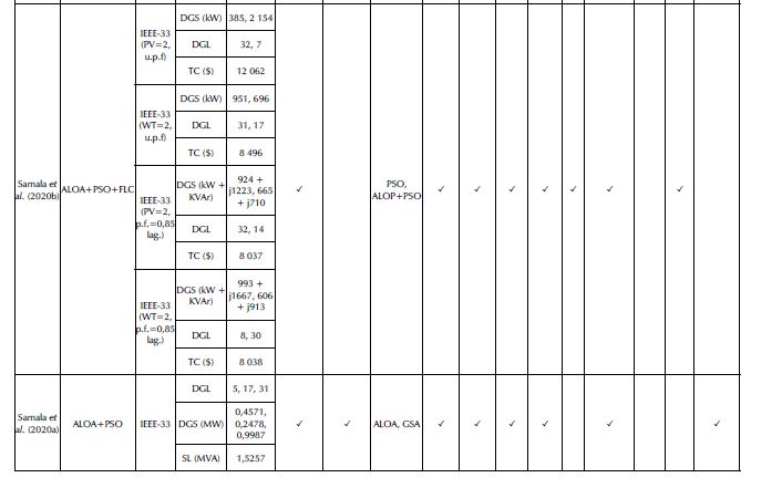Power quality parameters were also enhanced by incorporating a fuzzy logic controller (FLC) with hybrid optimization approaches. A hybrid optimization approach was proposed which integrates the features of the ant lion optimization algorithm (ALOA) and PSO. The multi-objective function was optimized in the presence of a training dataset offered by FLC, which resulted in optimized DG allocation. Such a process was evaluated in terms of load flow in the IEEE 33 test system. The results showed significant improvements stemming from the use of hybrid optimization techniques for different renewable energy-based power generators across a wide range of power factors. Said results were evaluated in comparison with those of ALOA and the proposed technique without FLC (Samala et al., 2020b).