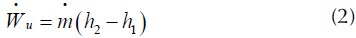 The consumption useful work rate (ẇu ) under single current, Q = 0, uniform properties, and not considering kinetic and potential energy variations, becomes a function of the difference regarding enthalpy between the initial state 1 (at the input of the pump) and the final state 2 (at the output of the pump), which is given by Equation (2):