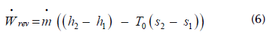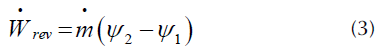 The reversible work rate (Wrcv) is given by Equation (6), which does not consider kinetic and potential energy variations: