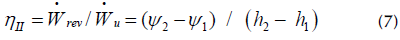 The second-law efficiency (ηll) is the ratio between the minimum power (reversible work rate) and the real power (consumption useful work rate) for devices that consume power: