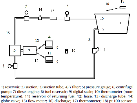 By measuring the pressure and temperature parameters at the pump inlet and outlet, it is possible to determine the values of enthalpy and entropy in order to obtain the reversible work rate (Ẇrev ), the consumption useful work rate (Ẇu ), and the second-law efficiency (ηll).Figure 1 shows the experimental apparatus used in the tests.