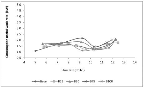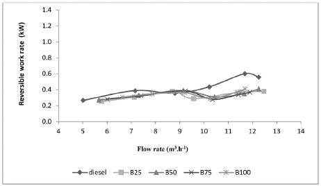 The consumption useful work rate and the reversible work rate at the maximum pump speed (3 300 rpm) for the diesel-soybean biodiesel mixtures are shown in Figures 2 and 3. The lower consumption useful work rate and reversible work rate occur under the lower flow rate conditions.