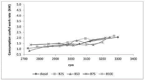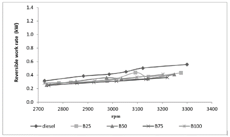 The consumption useful work rate and the reversible work rate at maximum flow rate for the diesel-soybean biodiesel mixtures are shown in Figures 4 and 5. The lower consumption useful work rate and reversible work rate occur at the lower speed conditions.