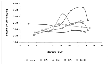 The behavior of the second-law efficiency is shown in Figure 6 as a function of the flow rate at maximum pump speed for diesel, diesel-soybean biodiesel mixtures, and soybean biodiesel. The efficiency ranges from 15,80% (B50 at 5,66 m3/h) to 36,82% (diesel at 11,69 m3/h). In the case of soybean biodiesel (B100), the efficiency ranges from 19,29%, at 6,63 m3/h to 32,05%, at 9,2 m3/h. The maximum second-law efficiency (25,02%) for the mixtures of soybean biodiesel with diesel occurs for B50 at 11,66 m3/h. The average second-law efficiency value for all fuels used in the centrifugal pump at maximum pump speed (3 300 rpm) was 22,64%.