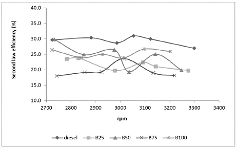 The behavior of the second-law efficiency as a function of pump speed at maximum flow rate is shown in Figure 7 for diesel, diesel-soybean biodiesel mixtures, and soybean biodiesel. The efficiency ranges from 17,98% (B75 at 2 742 rpm) to 30,93% (diesel at 3 054 rpm). In the case of soybean biodiesel (B100), the efficiency ranges from 23,81% at 3 012 rpm to 26,69% at 3 097 rpm. The maximum second-law efficiency (29,78%) for the mixtures of soybean biodiesel with diesel was obtained by B50 at 2 733 rpm. At the maximum flow rate, the average second-law efficiency value for all fuels used in the centrifugal pump was 24,03%.