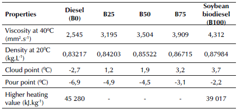 Table 1 shows the properties of the diesel-soybean biodiesel blends.