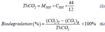 where ThCO2 is the theoretical amount of CO2 that each bio-adsorbent can produce (g); MTOT is the amount of dried solids (g) added at the beginning of the test; C TOT is the ratio of total organic carbon present in the samples' dried solids; 44 and 12 are the molecular weights of CO2 and carbon, respectively; (CO2)T is the accumulated amount of CO2 (g) released from each setup; and (CO2)B is the accumulated amount of CO2 from the blank (g).
