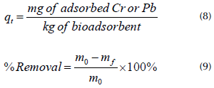 where qt is the amount adsorbed (mg/kg), m0 is the initial mass of the metal ions, and mf is the final mass of metal ions.