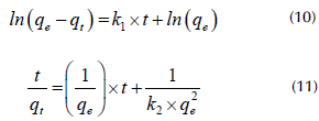 where qe is the amount of adsorbate uptake per mass of adsorbent at equilibrium, k1 (1/time) is the rate constant of the pseudo-first-order equation, and k2 (mass/mass x time) is the rate constant of the pseudo-second-order model.